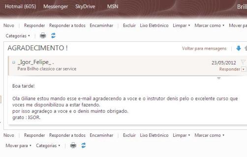 Antes de mais nada gostaria de dizer sobre o meu contentamento com o curso que vc me administrou, e estou convencido de que saí do curso apto a exercer tranquilamente esta valiosa profissão neste mercado competitivo''.-